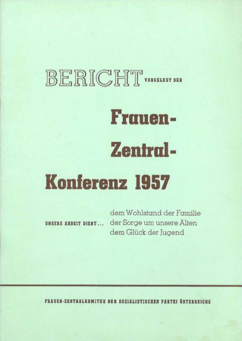 Der Bericht für die Frauen-Zentralkonferenz 1957 in Salzburg wurde im Rahmen des Informationsdienstes des Frauenzentralkomitees der SPÖ Nr. 7/11 Juli/November 1957 abgedruckt.